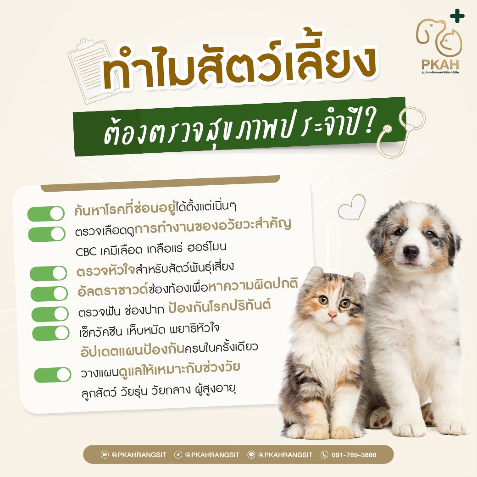 - ตรวจปีละครั้ง ช่วยให้เรารู้ทันโรคแอบแฝงหลายโรคในน้องหมาน้องแมวไม่แสดงอาการจนกว่าจะรุนแรง การตรวจประจำปีช่วยคัดกรองโรคได้ตั้งแต่ระยะเริ่มต้น