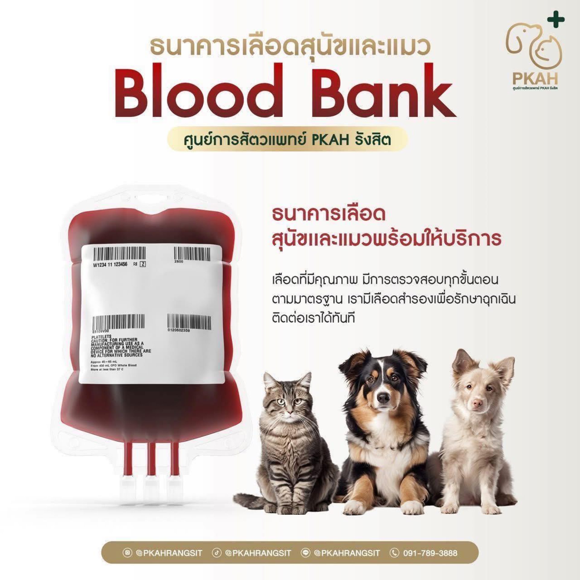 เรามีธนาคารเลือดสุนัขและแมวที่พร้อมให้บริการเลือด (Fresh whole blood) และส่วนประกอบของเลือด (Blood components) และบริการถ่ายเลือดสุนัขและแมว ด้วยเลือดที่มีคุณภาพ มีการตรวจสอบทุกขั้นตอนตามมาตรฐานเทียบเท่าธนาคารเลือดของคน